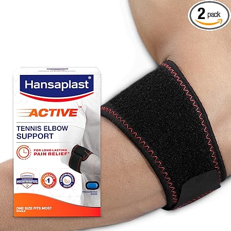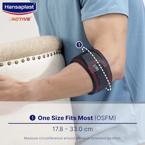 Hansaplast Active Tennis Elbow Support for Men & Women | 1 Unit | One Size Fits Most | Elbow Brace with visible Pressure Pad for Long Lasting Pain Relief | Skin Friendly Elbow Band/Guard with Adjustable Strap for Custom Fit | Tennis, Badminton, Cricket, Gym, Workout