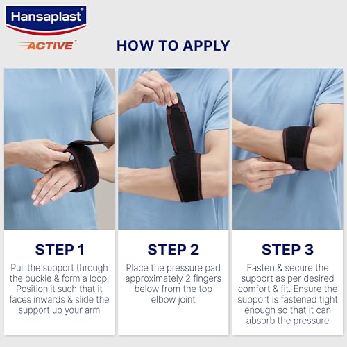 Hansaplast Active for Long lasting Pain Relief: Modern elbow support with fom pressure pad designed to provide optimal support along with wearing comfort to give Long Lasting Pain Relief so you can continue to stay active and live life uninterrupted. | RECOMMENDED BY EXPERTS: Recommended by the Indian Association of Physiotherapists. | Dermatologically Tested and skin friendly, non-irritant to the skin.| From Germany’s No. 1 Plaster Brand with 100 years of expertise in healing everyday wounds & injuries. | VISIBLE PRESSURE PAD: to guide correct placement of the pad and help absorb impact. | ADJUSTABLE STRAP: for custom fit and support. | BREATHABLE SOFT MATERIAL: for wearing comfort.